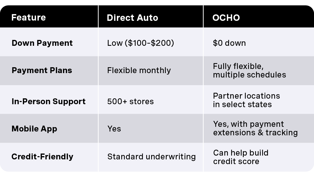 That's where a service like OCHO could resonate — offering the flexibility and affordability (especially the $0 down payment option) without some of the common frustrations reported by Direct Auto customers.