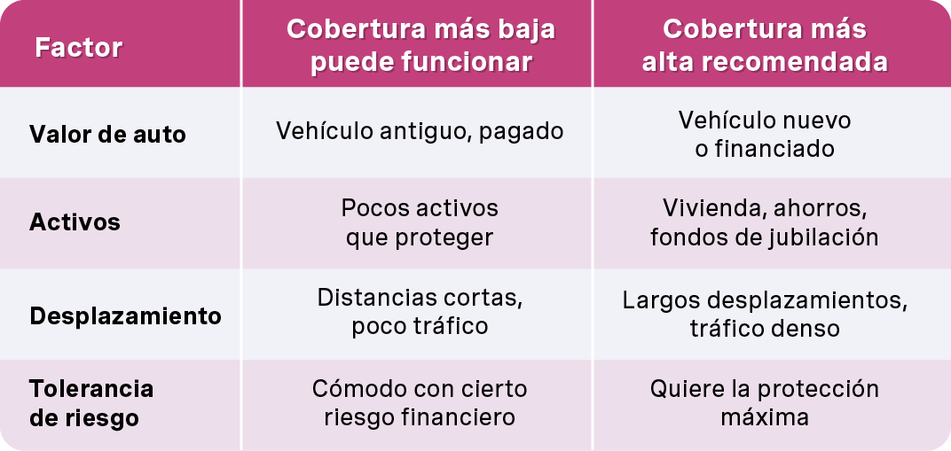 La mejor póliza para ti combina los requisitos estatales, tus factores de riesgo personales, tu presupuesto y el valor de tu auto en una cobertura que realmente te protege.