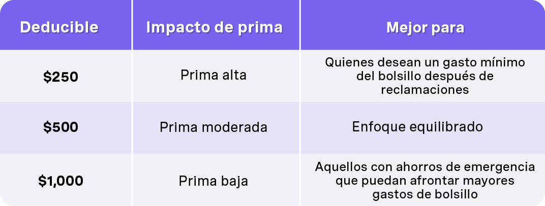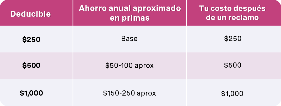 Los ahorros en las primas de un deducible muy alto pueden ser contraproducentes si no puedes pagar las reparaciones cuando sucede algo. Revisa tu opción de deducible anualmente, especialmente después de los cambios en tu fondo de emergencia o el valor de tu auto.